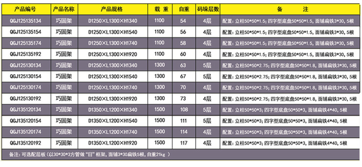 巧固架 產品特點:底部碼垛角鐵成80°設計促使碼垛的巧固架越壓越緊。
