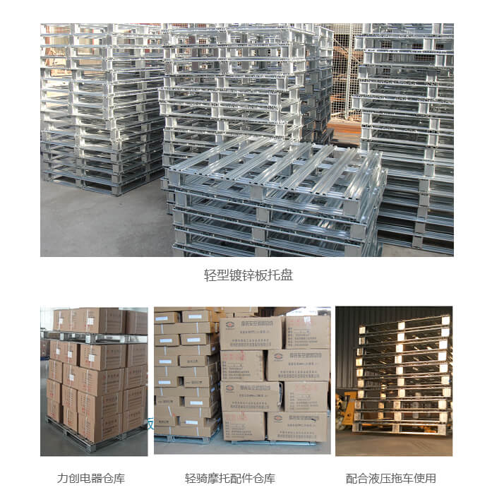 輕型B型鍍鋅托盤 產品用途: 本產品采用上海寶鋼大鋅花0.5—1.0mm厚的鍍鋅板軋壓變形,優點質量輕承重好,焊點處涂銀粉油漆或植物桐油防止焊點生銹。應本產品熱鍍鋅層面工藝,防銹能力非常強,廣泛用于輕工業制造,如冷鏈、食品車間生產、酒水制造,電子制造倉儲與周轉。對比木板托盤免熏蒸,常作為隨貨底托,隨產品一次性出口。提示:不建議上貨架,如上貨架,主材厚度1.2mm。