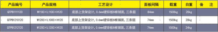 產品名稱:輕型B型鍍鋅托盤 產品編號:QTPB1210120 產品規格:W1200×L1000×H120 托盤主孔:100mm 托盤側孔:80 mm 產品自重:20kg 產品靜載:800kg 產品動載:600kg 上貨架載:300kg 產品配置:采用寶鋼鍍鋅板軋機成0.6*10*85多筋骨面板 10根,以間隔84mm 和6根板做腿+12個立撐 組成。 產品用途:廣泛用于酒水、食品、化工、電子等大量物品 倉儲與周轉。本結構為上貨架設計。